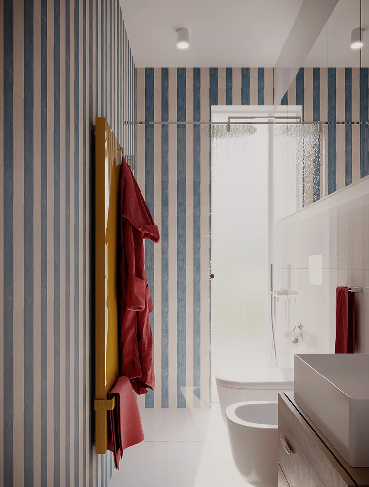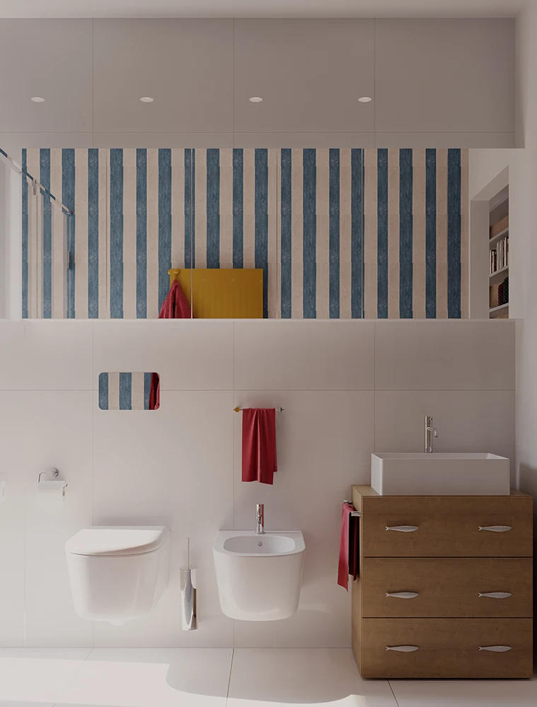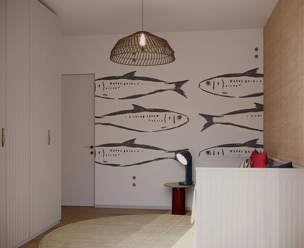 Tra i materiali utilizzati, spiccano pavimenti in gres effetto legno e rivestimenti in piastrella decorativa con il soggetto di una sardina, scelti per conferire carattere e autenticità agli spazi bagno e cucina. La rubinetteria cromata e i sanitari opachi si inseriscono con discrezione, esaltando la qualità complessiva dell’intervento.