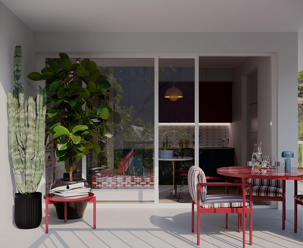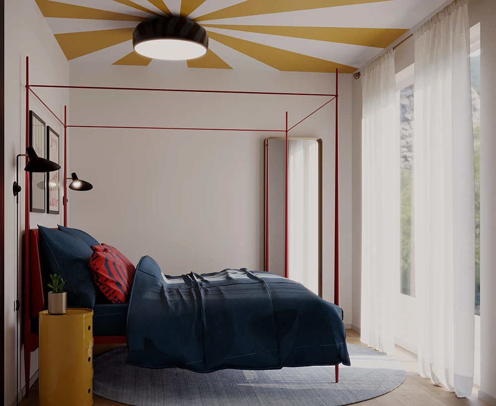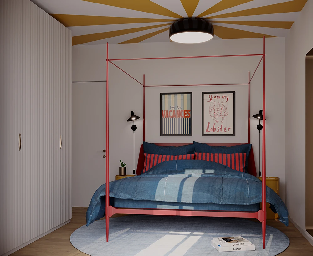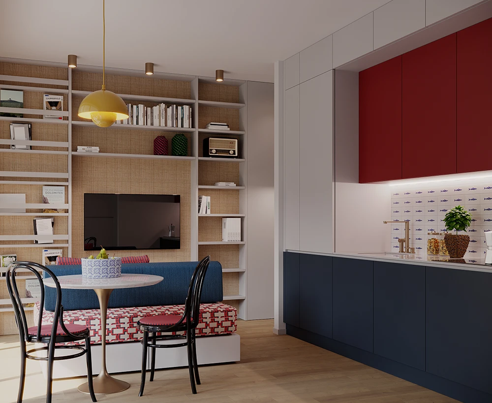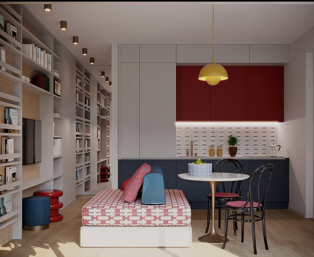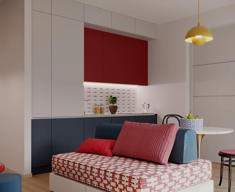 Il concept progettuale nasce dal desiderio di creare spazi luminosi, accoglienti e fortemente legati al contesto. La palette cromatica è protagonista: rossi intensi, blu profondi e tocchi di giallo senape richiamano i toni vividi dei paesaggi siciliani, della ceramica tradizionale e della natura mediterranea.