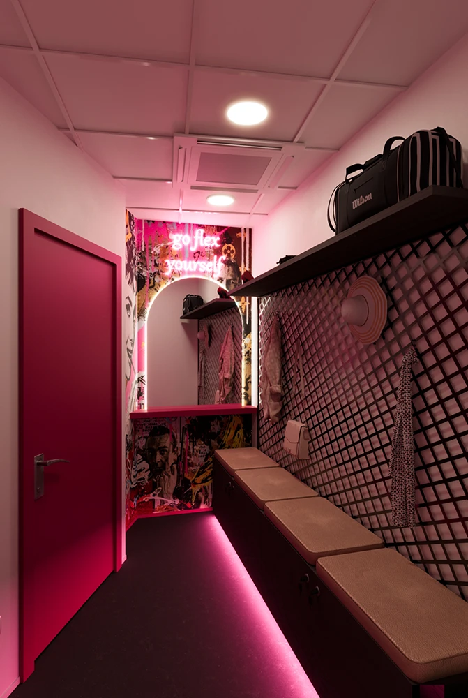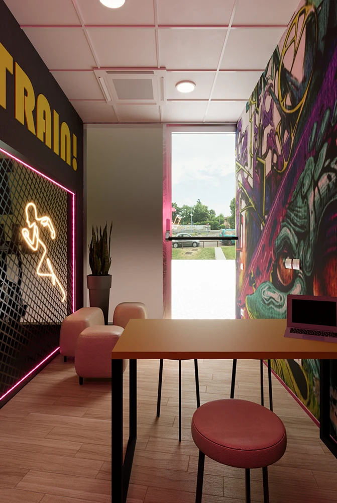 Abbiamo scelto colori vivaci, neon luminosi e graffiti dinamici per creare contrasti audaci e punti focali che stimolano l’occhio e l’energia del corpo. Ogni dettaglio è studiato per rendere lo spazio non solo pratico per l’allenamento, ma anche un ambiente che racconta un’identità urbana e contemporanea, capace di distinguersi e lasciare il segno.
