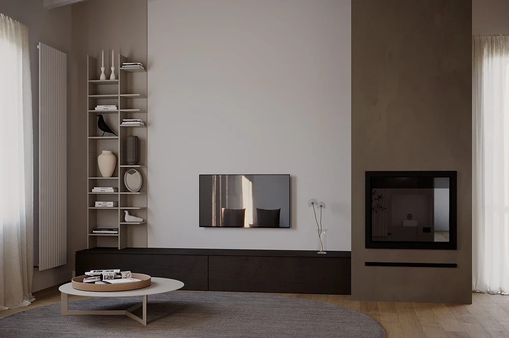 Per completare l’atmosfera e dare un ulteriore senso di calore, abbiamo inserito un camino integrato, pensato per accompagnare i momenti di vita quotidiana durante i mesi invernali. Un elemento che, pur rimanendo discreto, contribuisce fortemente alla sensazione di casa vissuta e personale.