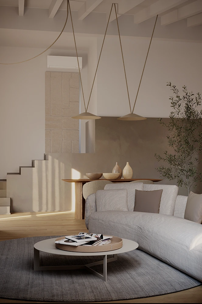Con il suo disegno pulito ed elegante, la lampada diventa non solo un punto luce ma un vero e proprio elemento architettonico sospeso, che dialoga con gli altri arredi in maniera armoniosa.