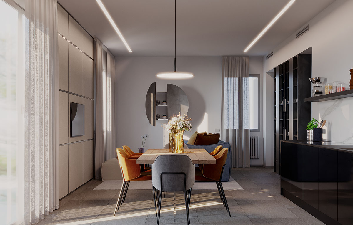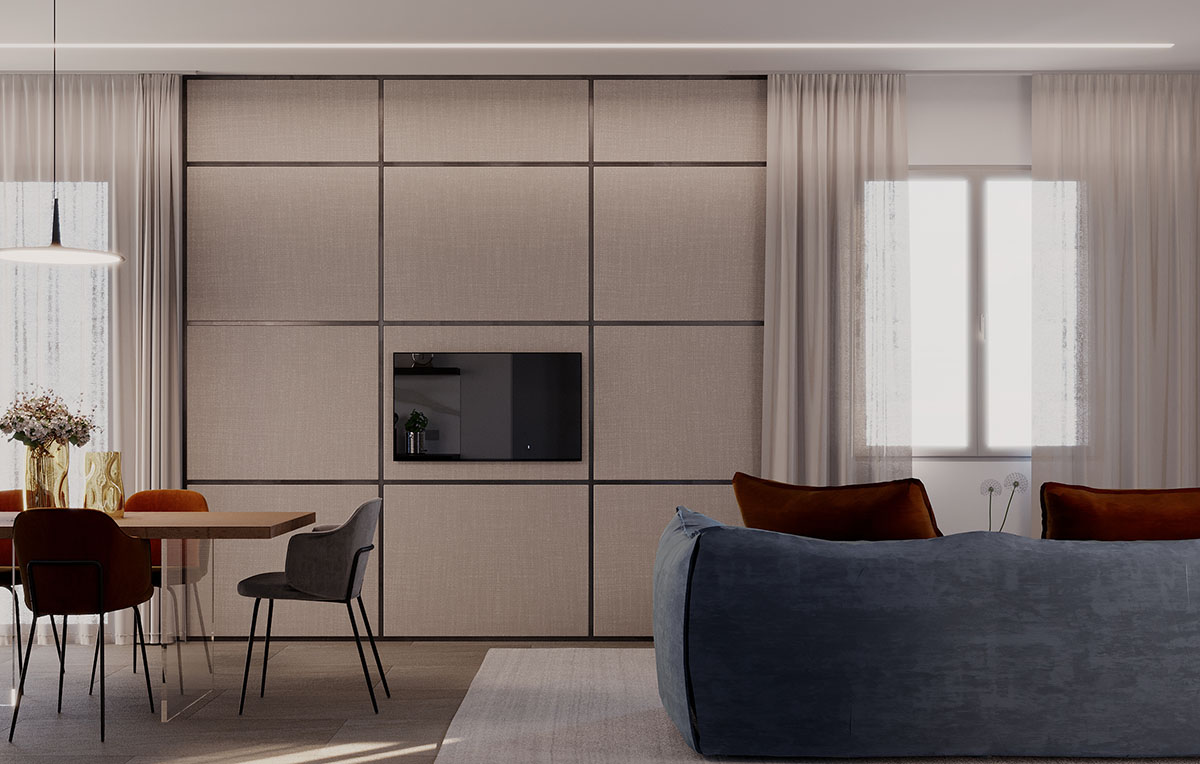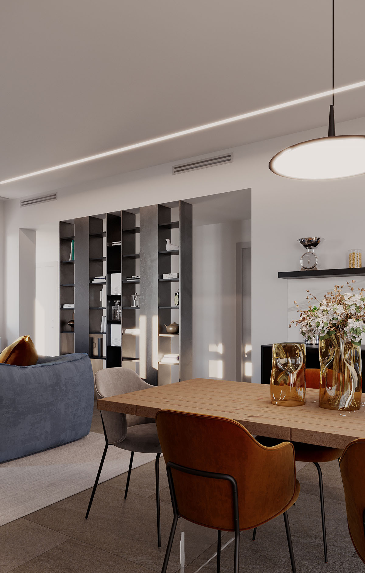 Abbiamo lavorato sulla definizione dei volumi, sulla scelta di materiali e palette cromatiche, per dare al living un’identità forte ma coerente con gli ambienti adiacenti. Il risultato è uno spazio più ricco di sfumature, dove la linearità delle forme dialoga con texture materiche e dettagli su misura, creando un equilibrio tra eleganza e originalità.