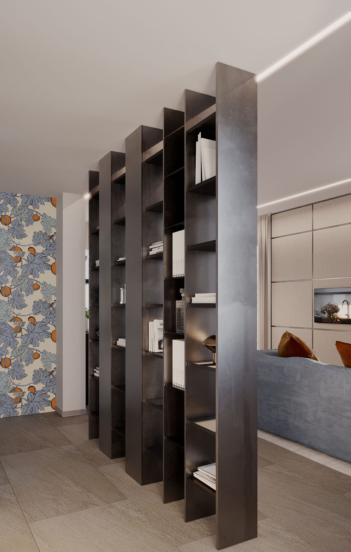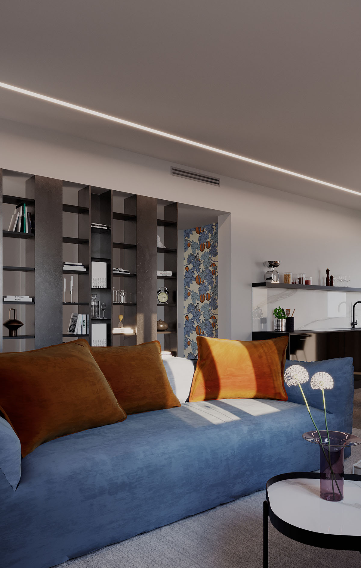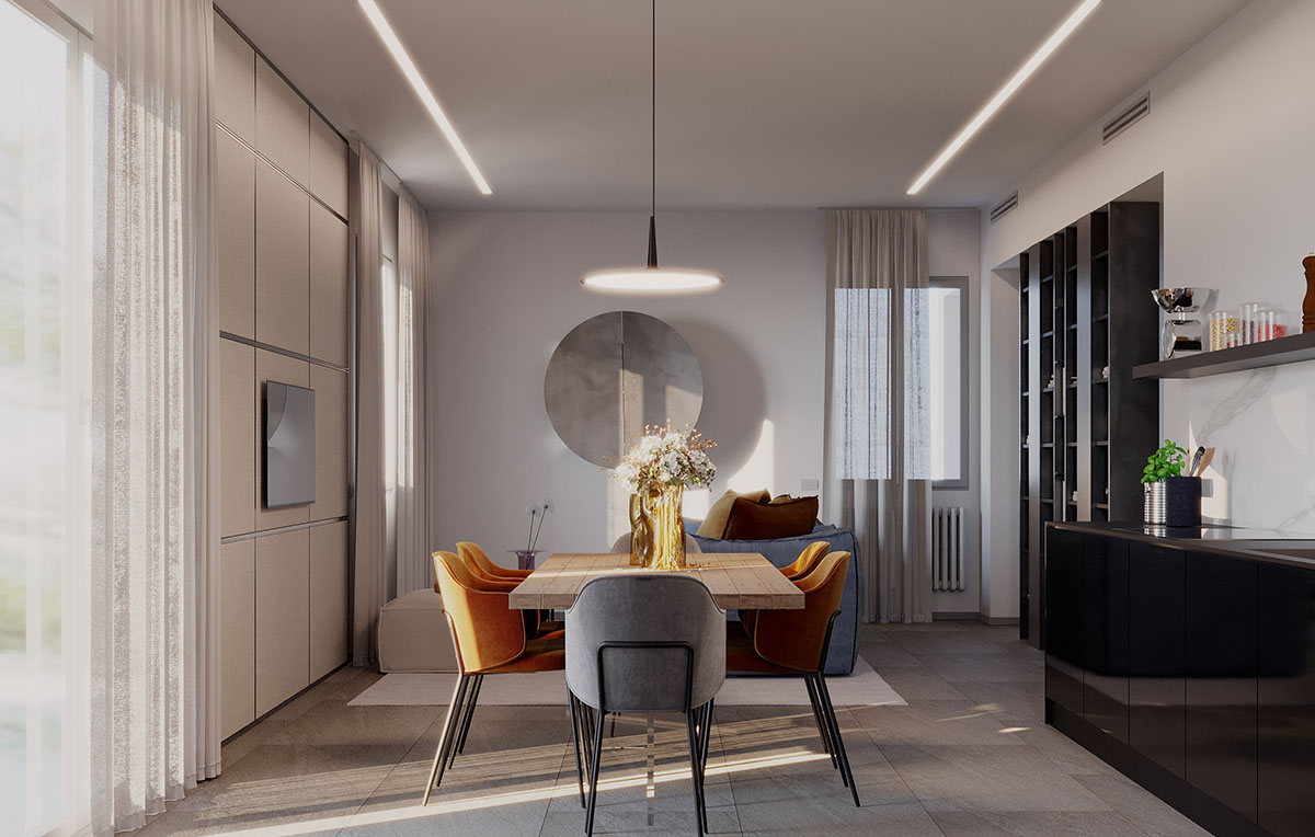 Abbiamo lavorato sulla definizione dei volumi, sulla scelta di materiali e palette cromatiche, per dare al living un’identità forte ma coerente con gli ambienti adiacenti. Il risultato è uno spazio più ricco di sfumature, dove la linearità delle forme dialoga con texture materiche e dettagli su misura, creando un equilibrio tra eleganza e originalità.