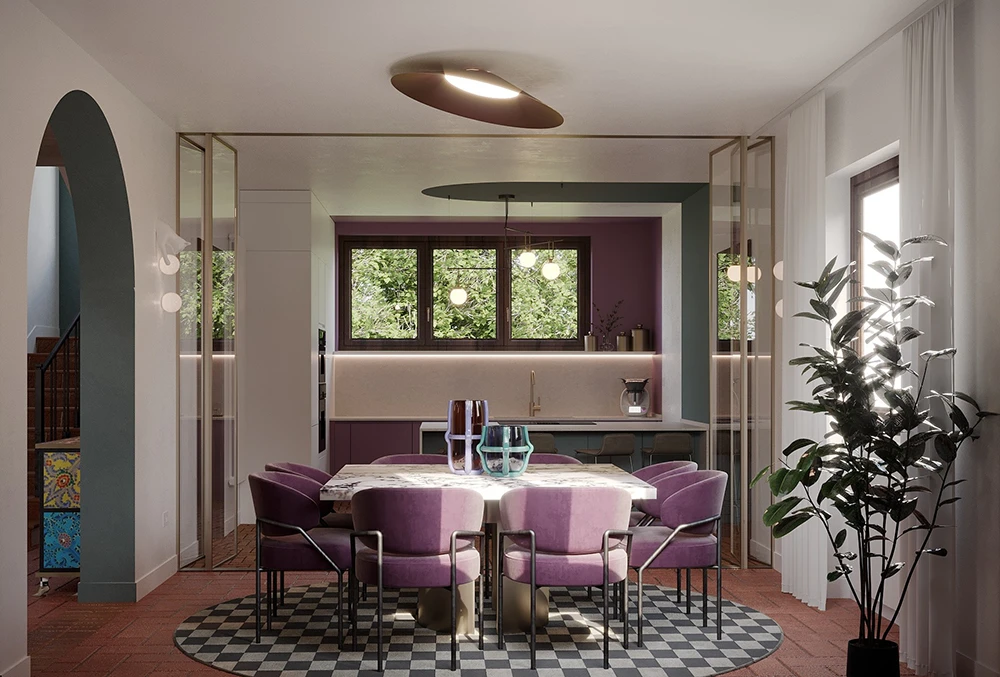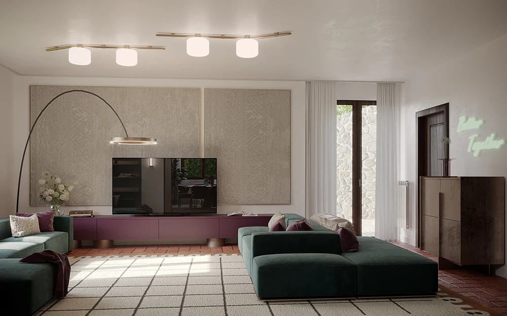 Il living rappresenta il cuore della villa, concepito come spazio conviviale e rilassante. La scelta cromatica gioca su toni tenui ma decisi: il purple e il verde petrolio definiscono punti focali e contrastano delicatamente con superfici neutre.